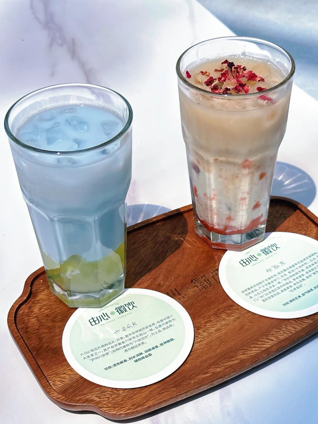 炎炎夏日,由心•徽饮推出徽茶特调清凉新品。祁门妃子笑以祁门红茶为基底,融合茶冻、荔枝和玫瑰,清新养眼,每一口都是清爽沁甜的感受;浮白栀翠以六安瓜片为基底,结合茶冻和青提等夏日应季食材,调制出一杯冰爽解暑的养颜佳品。