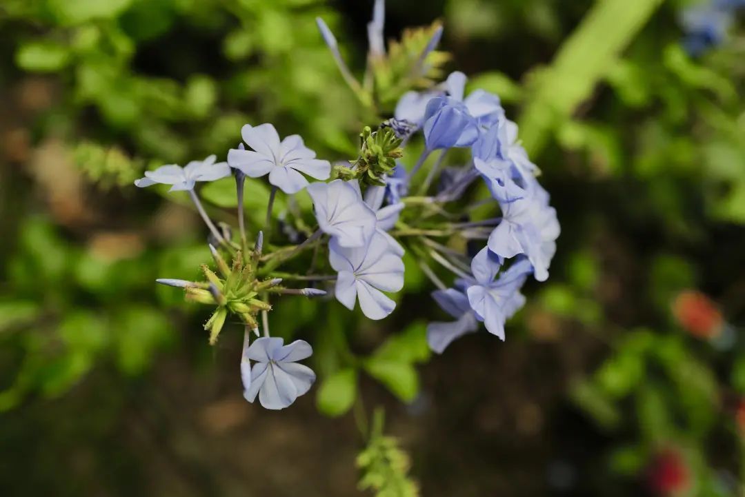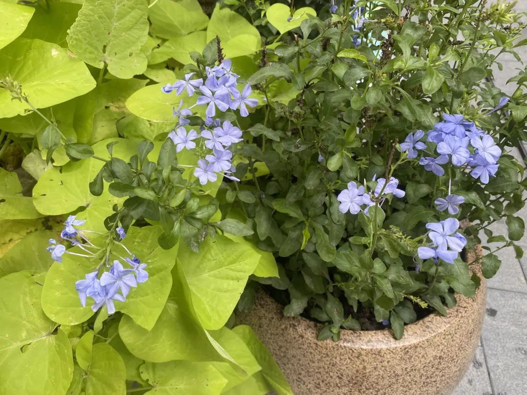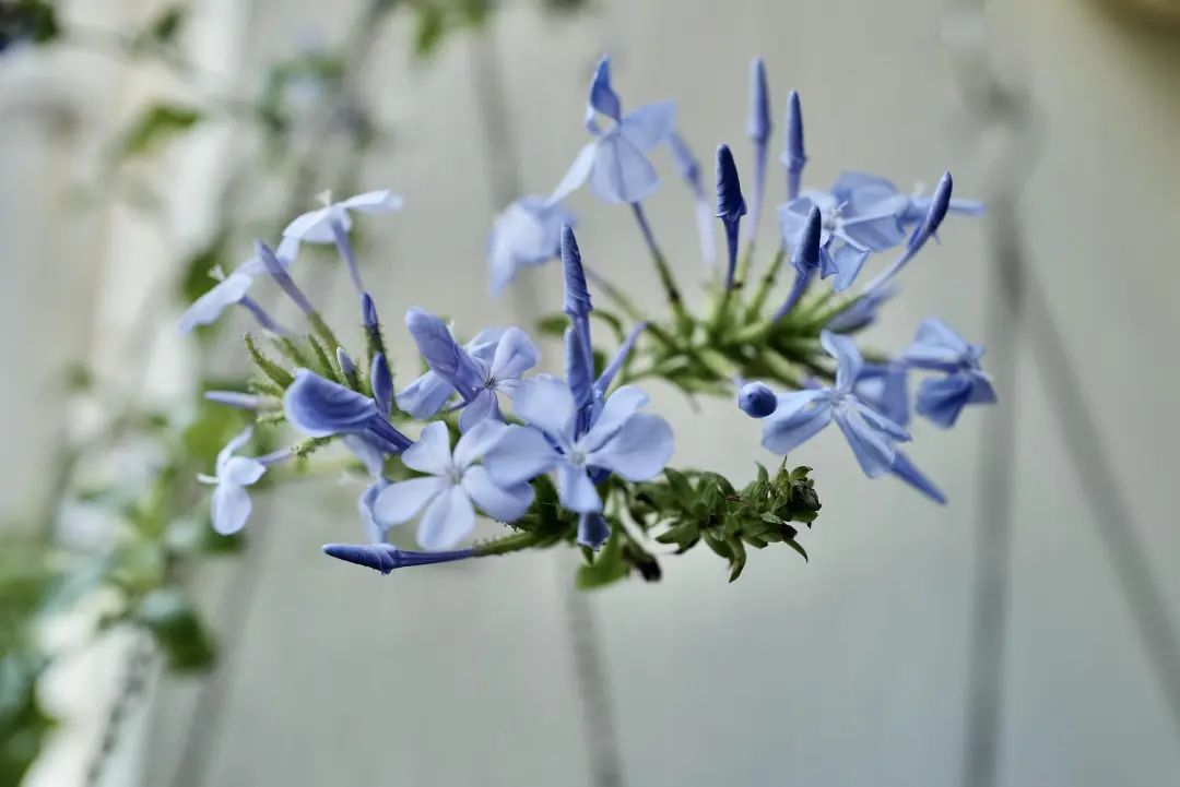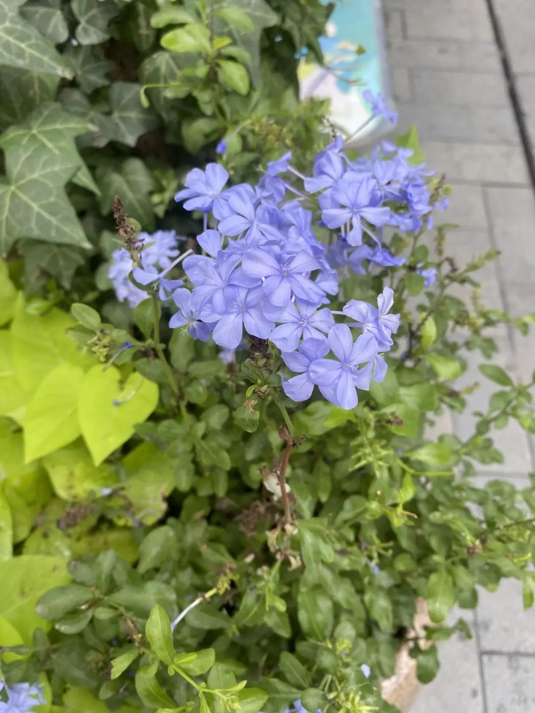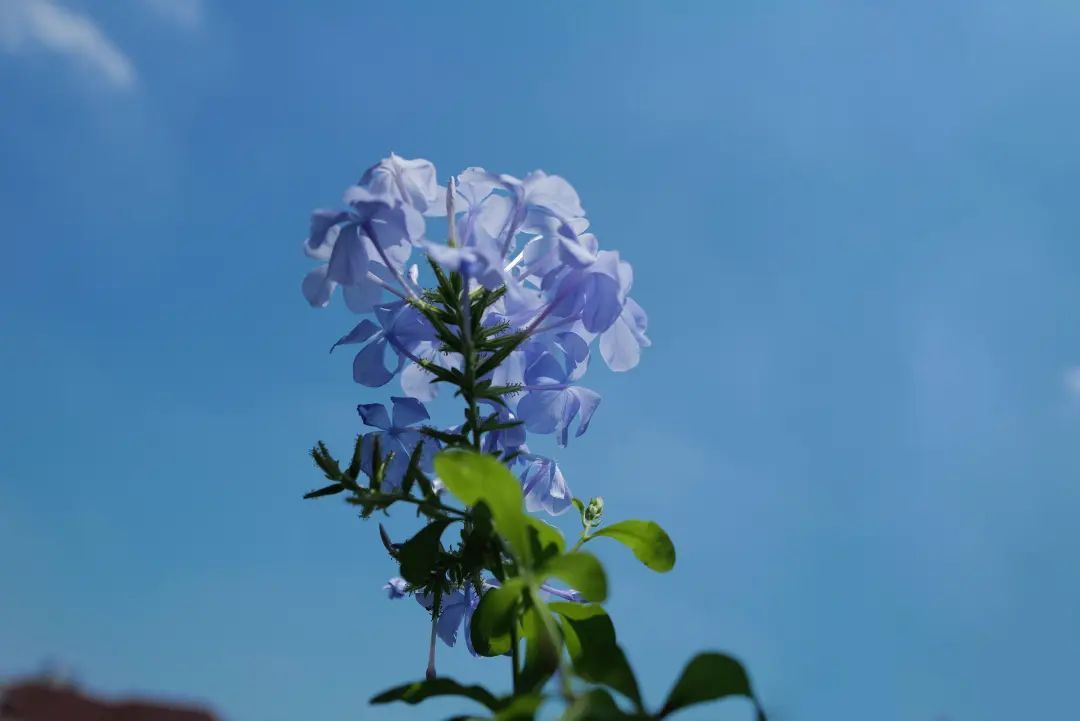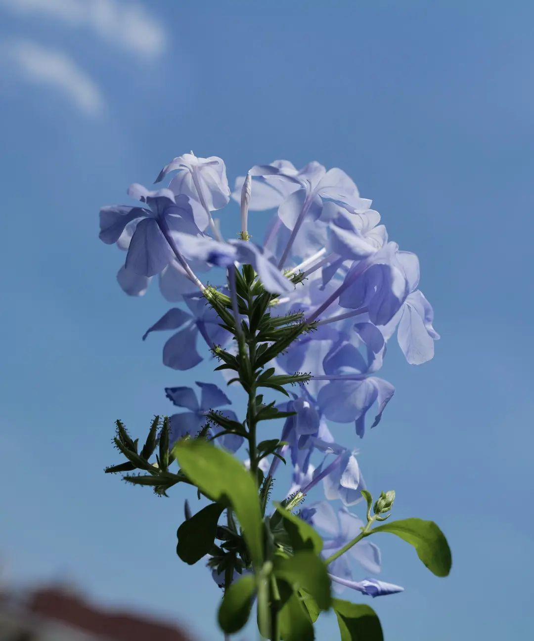 它叫蓝雪花,蓝中带紫的颜色显得脱俗独特。它的花头不大,五片花瓣经络分明。当盆栽爆花的时候,像一片片蓝色的小雪花,清新雅致的蓝色小花蕾在炎夏中凸显得清爽宜人。