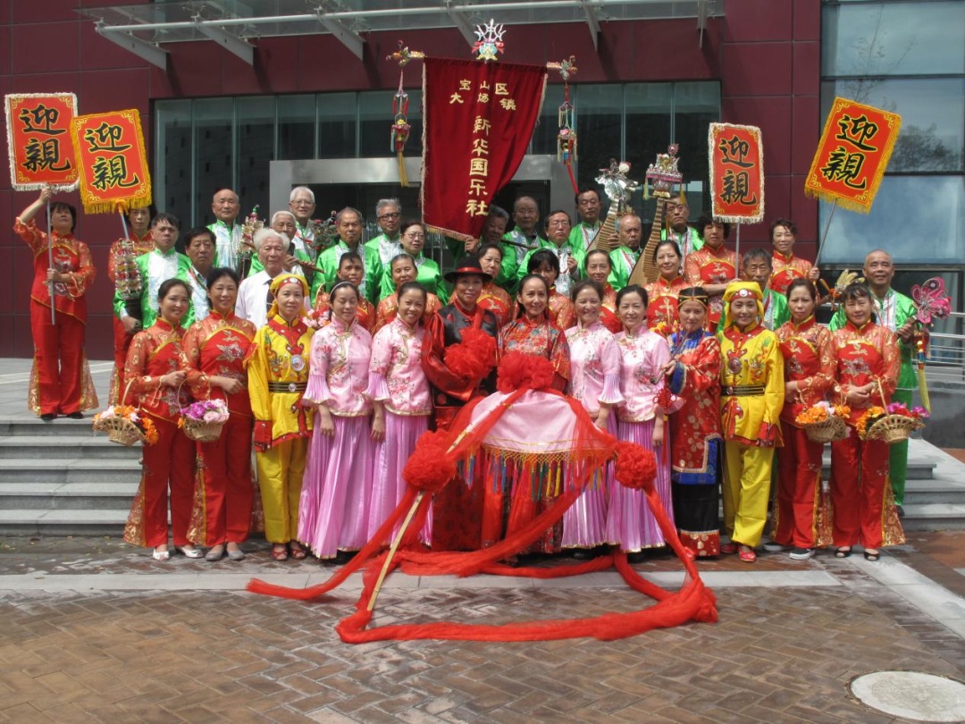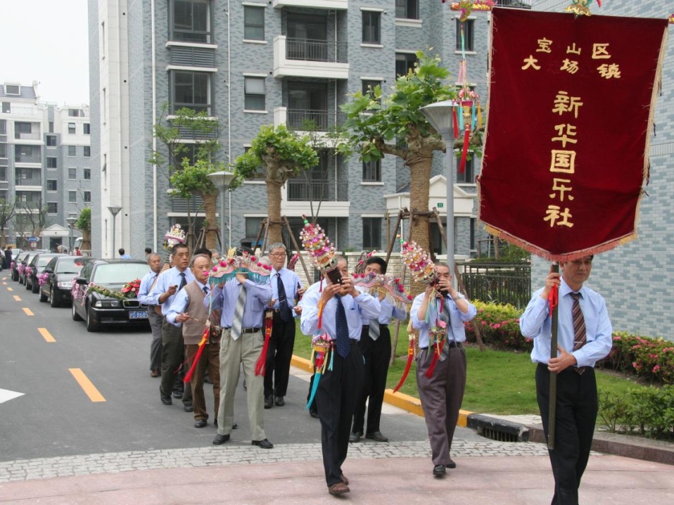 百年之前,大场地区即广泛流行丝竹乐,它源自民间,流传于民间,是老百姓自娱自乐的一种艺术形式。在20世纪初开始形成自己的特色和风格,而且日趋盛行,民间乐队以顾氏兄妹牵头组织的“渡船桥义务国乐社”最为著名,乐队成员十余人,被民众称之为“先生”,他们都是些小手工业者或农民,白天从事自身职业,挣钱养家,业余练习,闲时演出,无偿为民间婚丧嫁娶、节日节庆助兴。演奏时着长衫、戴礼帽,乐器上挂有发光电珠的龙凤彩头、用社旗开路。那飘扬的社旗、五色发光的彩头、悠扬悦耳的乐声,不论是喧闹奢华、增添喜庆,还是生死别离、抚慰心灵,江南丝竹都在用它独特的音乐触角去抵达人内心深处最柔软的领域。1980年,在多方支持下,原“渡船桥义务国乐社”更名为“新华国乐社”。