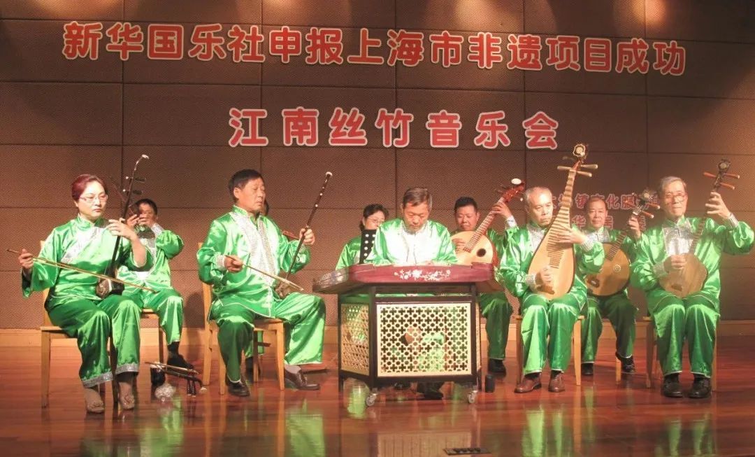 2009年4月,大场江南丝竹申报成功,列入“上海市非物质文化遗产”名录。新华国乐社张根兴和陆德华老师分别于2010年、2016年成功获评《上海市非物质文化遗产项目代表性传承人》;杨兴根、李荷生分别于2014年、2023年获评《宝山区非物质文化遗产项目代表性传承人》。