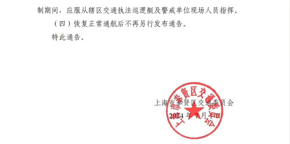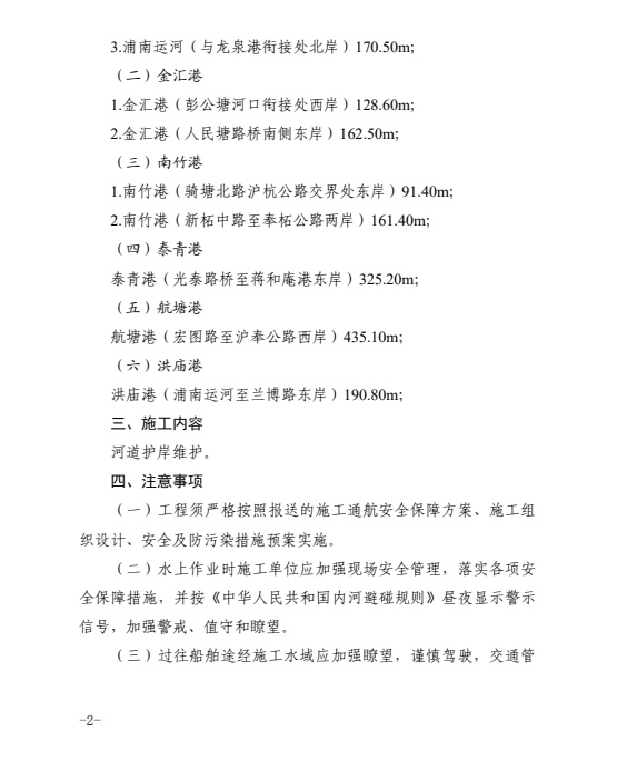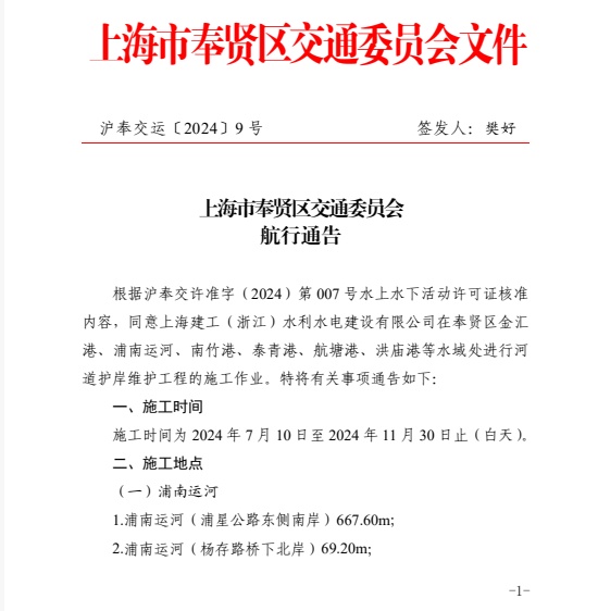 根据沪奉交许准字(2024)第007号水上水下活动许可证核准内容,同意上海建工(浙江)水利水电建设有限公司在奉贤区金汇港、浦南运河、南竹港、泰青港、航塘港、洪庙港等水域处进行河道护岸维护工程的施工作业。特将有关事项通告如下:
