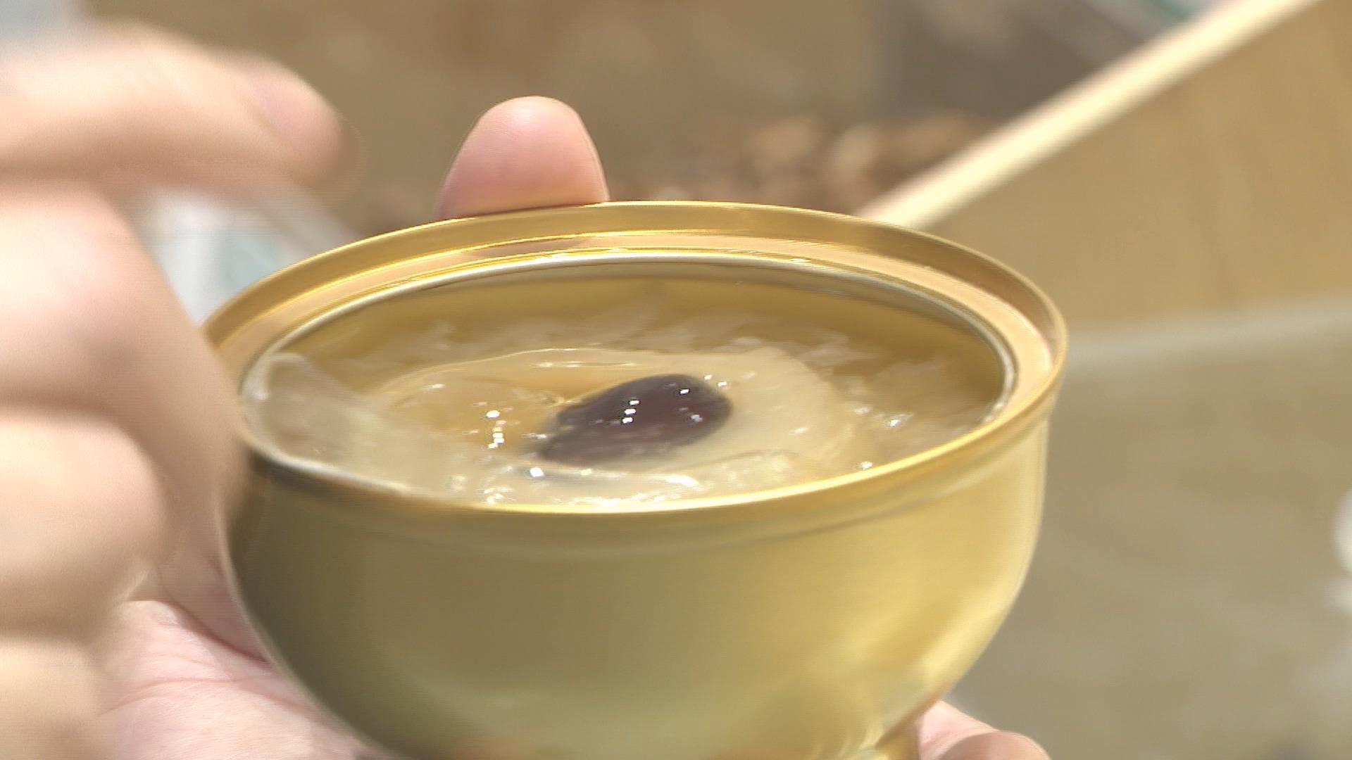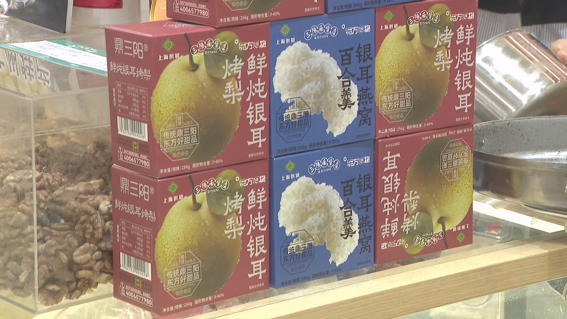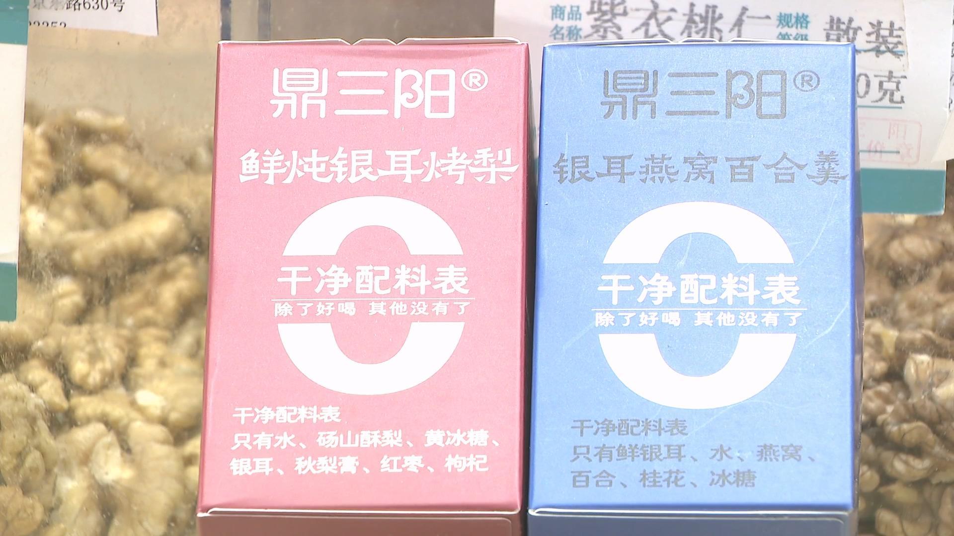 7月9日上午,记者在三阳南货店南北货柜台前看到,“银耳燕窝百合羹”和“鲜炖银耳烤梨”摆放在显眼的位置,不时有市民游客前来选购。“甜度正好,对于年纪大的人来说正合适,以后出去旅游就很方便了。”