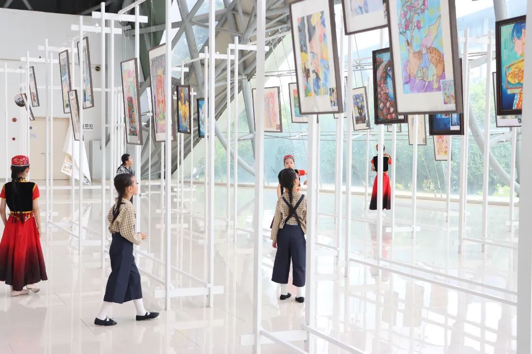 欣赏演出之余,孩子们还欣赏了在剧场外围展出的儿童画展。
