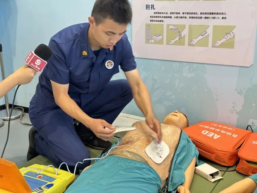 在体验馆的另一个角落,消防员耐心地展示了AED自动体外除颤器的使用方法。“你知道吗?在公共场合遇到有人心脏骤停时,AED就是我们的‘救命神器’!通过简单的几步操作,就能为患者赢得宝贵的抢救时间。”