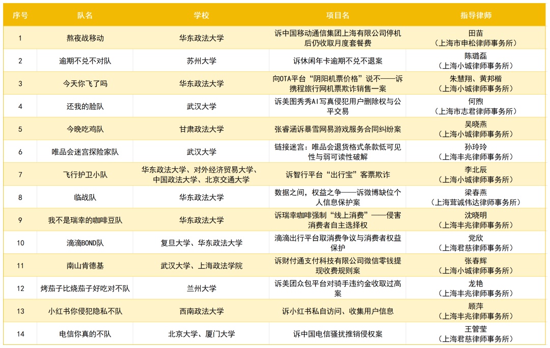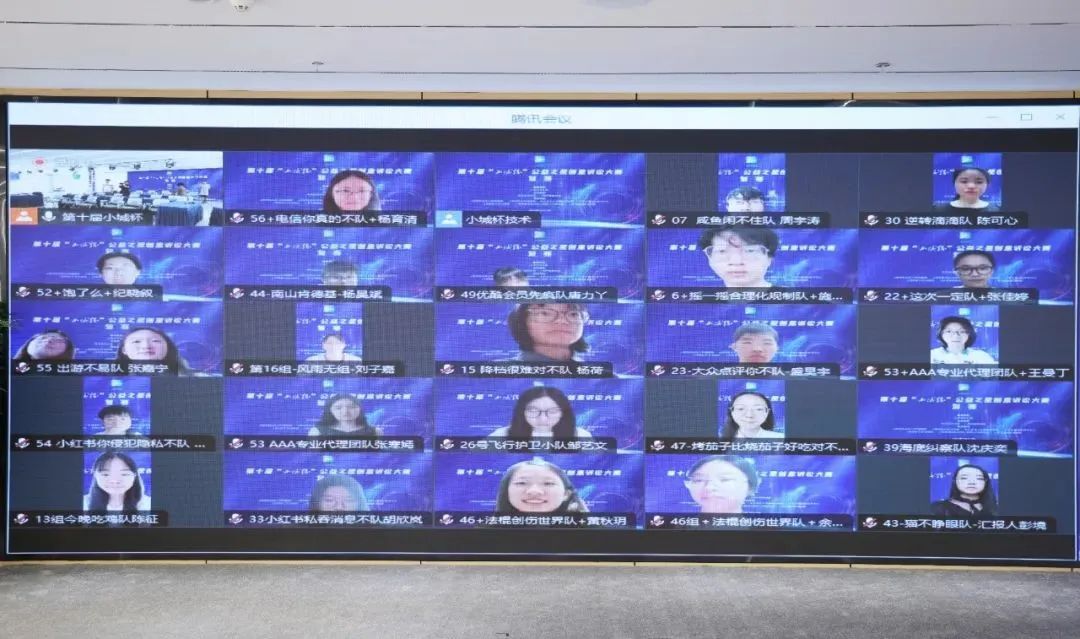本次大赛共吸引了80所院校260支队伍参赛,诉讼的范围涉及人工智能、互联网、购物、个人信息保护等领域,56支队伍通过线上展示的形式展开激烈角逐。现场评委就政治性、公益性、社会影响力、可诉性、创新性以及现场表现力等方面对各队伍进行评分评议,最终,确定了14支队伍进入决赛!
