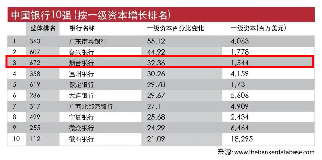 在“中国银行10强(按一级资本增长排名)”榜单中,烟台银行以32.36%的增幅位居全国第三,一级资本15.44亿美元。