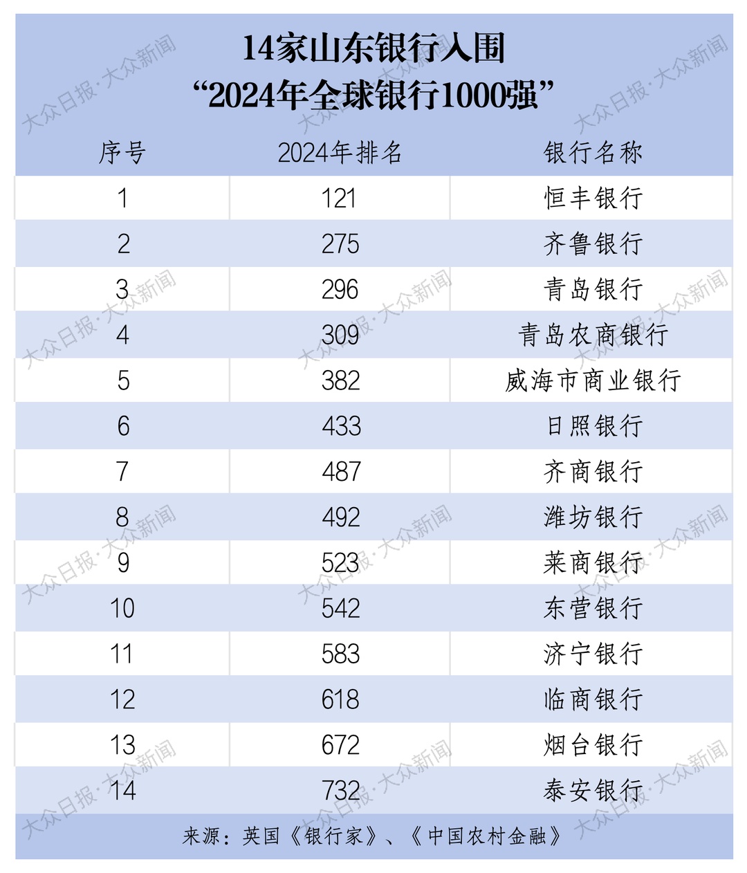 7月10日,英国《银行家》杂志(The Banker)公布“2024年全球银行1000强”最新榜单。大众日报·大众新闻客户端记者梳理发现,山东14家银行跻身榜单,与去年数量齐平,分别是:恒丰银行、齐鲁银行、青岛银行、青岛农商银行、威海市商业银行、日照银行、齐商银行、潍坊银行、莱商银行、东营银行、济宁银行、临商银行、烟台银行、泰安银行。