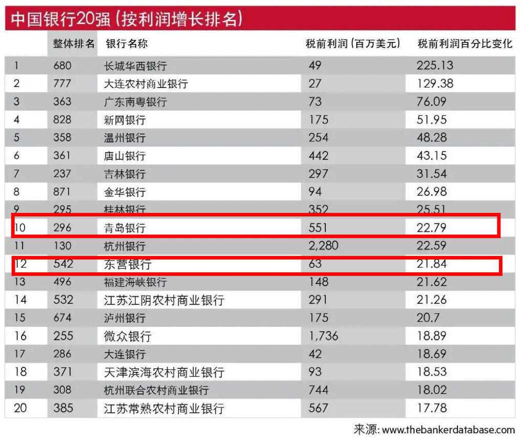 在“中国银行20强(按利润增长排名)”榜单中,青岛银行、东营银行分别入围。其中,青岛银行以5.51亿美元的税前利润位列第10名,增幅22.79%。东营银行位列该榜单全国第12名,税前利润6300万美元,增幅21.84%。