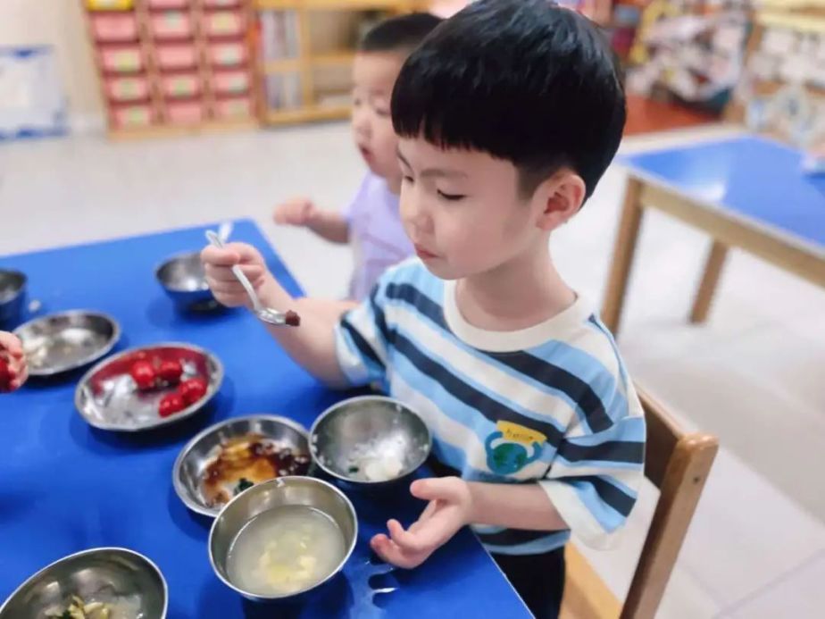 考虑到暑假高温酷暑的天气特点,不少幼儿园将户外2小时运动时间提前,安排幼儿在树荫下运动,开展玩水等清凉活动;高温日则将户外活动移至室内中庭,在确保安全的情况下,保证幼儿每日有足够的运动量。东方锦绣幼儿园还特制了夏季清凉版餐食,为幼儿提供消暑的绿豆汤和自制清凉饮品,鼓励他们从时令变化中感受“美在生活”。