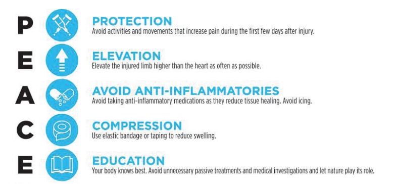 那么,面对踝关节扭伤,我们应该如何处理呢?近年来,软组织损伤的处理原则经历了从ICE到RICE、PRICE,再到POLICE的不断改进。然而,这些原则都只注重急性期的管理,忽视了软组织在亚急性期和慢性期的恢复及治疗。为此,2019年英国运动医学周刊提出了针对软组织损伤的“PEACE & LOVE”新原则。