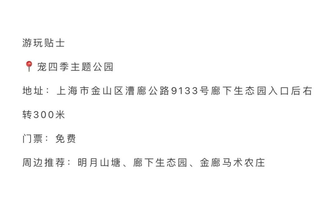 宠四季主题公园位于廊下郊野公园内,是一处以宠物为主题的大型休闲服务乐园,园区内摩天轮、小火车、游泳池等设施一应俱全,还设有围栏,大型犬和小型犬可以分区玩耍,充分满足宠物的多样化需求。