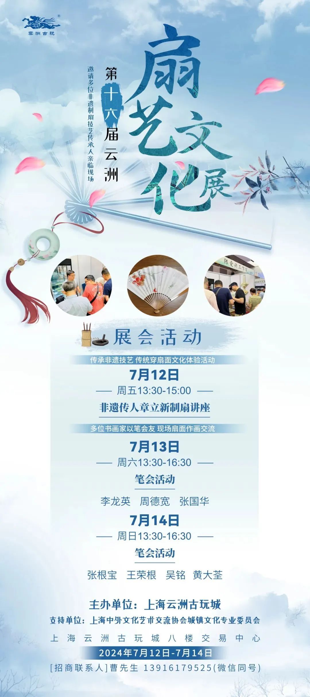 云洲扇艺,古韵今风,第十六届云洲扇艺文化展将于7月12日至14日在云洲八楼交易中心开幕。除国内知名制扇工坊外,来自安吉的陈爱兴、张国斌,来自徽州的程新安等多位制扇名师也将携其作品亲临现场。