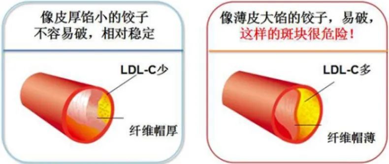 颈动脉斑块分为稳定斑块和不稳定斑块。稳定斑块就像皮厚馅少的饺子,不容易破,相对稳定,但斑块体积逐渐增大,会造成管腔狭窄或闭塞,导致缺血性脑卒中;不稳定斑块也称易损斑块,就像皮薄馅多的饺子,不稳定,容易破裂,造成部分斑块组织脱落并随血流堵塞动脉,或在破损局部形成急性血栓,造成缺血性脑卒中。
