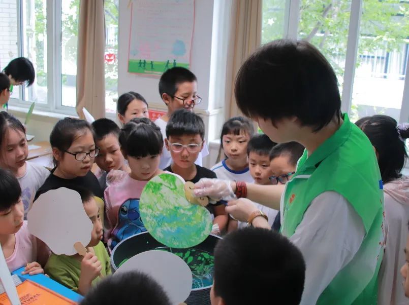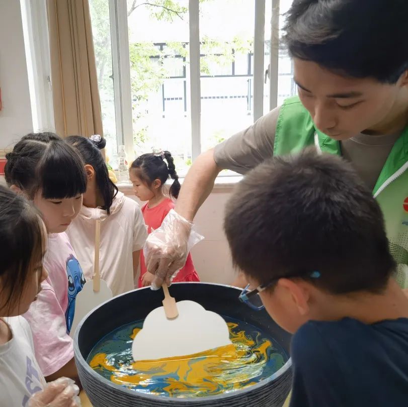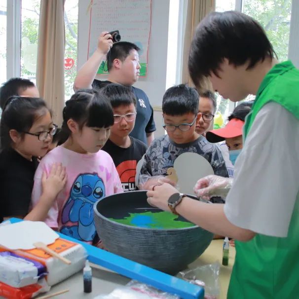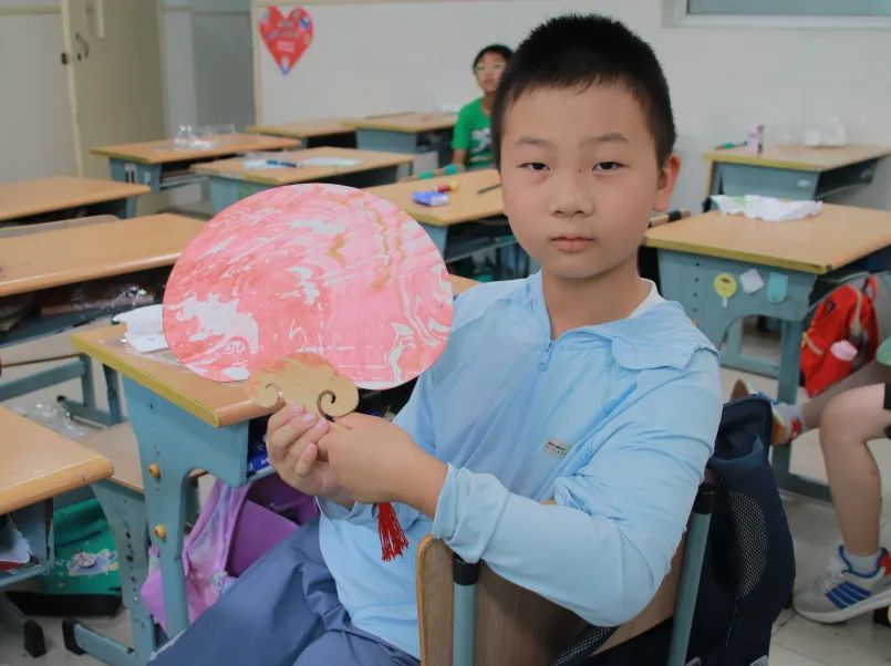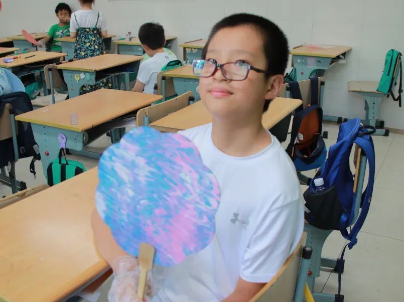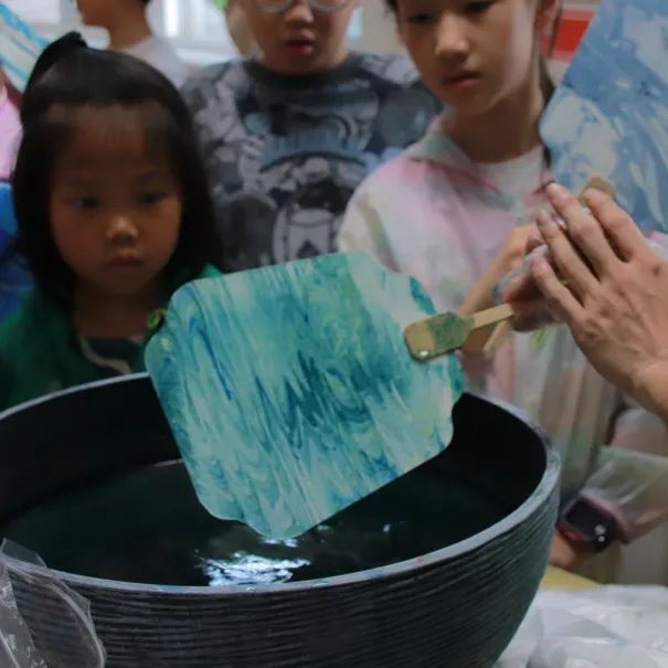 萌娃们充分发挥自己的想象力和创造力,挑选各自喜欢的新奇配色混合搅匀,随着不同颜色的漆料在水中晕染交错,萌娃们小心翼翼地将团扇浸入水中,扇子一进一出间,缤纷的色彩在扇面上翩翩起舞。