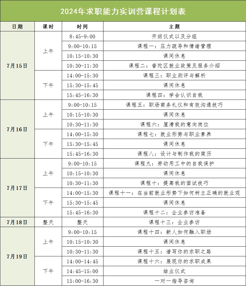 为进一步提升区域公共就业服务能级,有效服务应届高校毕业生等青年群体实现高质量充分就业,普陀区2024年“求职能力实训营”即将开营。实训营将围绕自我认知、求职准备、职场技巧、情绪管理、劳动保障与企业参访等课程单元,为学员们开展为期5天的实训体验,帮助提升自主就业能力。并且,在实训结束后还将为各位学员持续提供岗位推介、职业指导、线下招聘等综合性就业帮扶,跟踪就业情况,精准促进青年人就业。