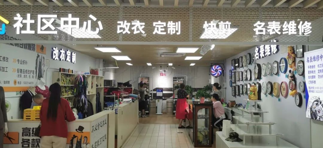 “社区中心”设立在海江路联华超市二楼,在今年年初刚刚完成升级改造,整体环境整洁敞亮,里面涵盖了名表维修、改衣定制、快剪等耳熟能详的便民服务。亲民的价格和娴熟的手艺让这里成为了周边居民们的第一选择。