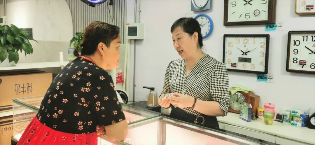 黄女士介绍:“以前我一直在市里面的钟表店上班。现在退休了,在这边还有老顾客、老生意,所以我就回来了,与其说是做生意,倒不如说是结交一些朋友,我们感到蛮开心的。”