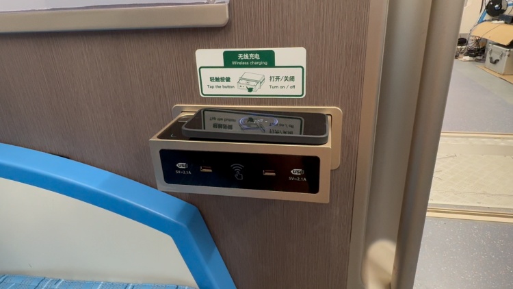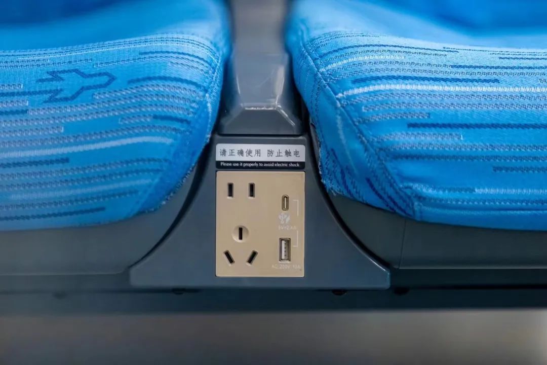 市域铁路列车的座位采用横纵结合的设计,每节列车大约有50多个座位。横排座位的底下设置了5眼的插座,纵排座位的附近则设置了USB接口和无线充电。参考地铁列车,市域铁路列车也设置了拉环扶手,供乘客站立时扶握,车厢内部还设置了专门停放轮椅的地方。