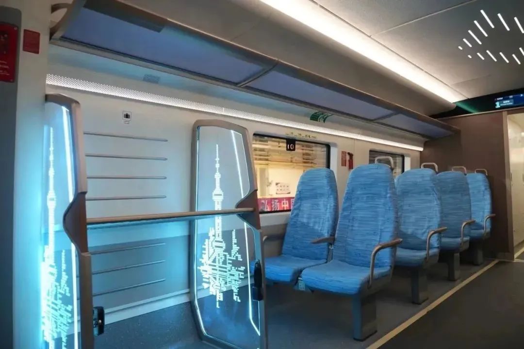备受上海市民关注的 虹桥⇋浦东的机场联络线 传来新消息 该联络线顺利完成逐级提速试验, 达到了176公里/小时的试验目标速度, 按照预测, 从虹桥2号航站楼 到浦东1号2号航站楼 仅需40分钟。 另据此前消息, 该联络线或将于9月1日试运行 预计今年年底正式通车! 能开到176公里/小时的 机场联络线列车究竟长啥样? 和地铁、高铁有何区别? 带你揭开列车的“神秘面纱” ↓↓↓ 宽敞明亮的列车车厢、 柔软舒适的蓝色座椅、 精心设计的上海元素、 便捷实用的无线充电 …… 上海机场联络线的设计兼具美观与实用 该线路使用的车型 是我国首列市域C型列车 作为目前国内最先进的市域动车组车辆 它基于复兴号智能城际动车组 技术平台开发 结合上海市域铁路机场联络线特点 进行了一系列研究与探索 并取得了重大技术突破: 首次采用头车和中间车相同车辆长度的设计,解决了车辆灵活编组、站台门的活动门等间距设置的需求; 车辆采用智能旅服、智能监测、智能运维和智能行车等前沿技术,大幅提升了车辆的智能化水平。 除此之外,还首次实现了CTCS2+ATO自动折返功能,大幅提高了运输效率,同时具备与国铁互联互通的条件。 走上列车,就能看到一个两层的发着光的大件行李存放处。行李架两侧的玻璃上用了东方明珠点阵画装饰,下层还设置了一条“安全带”,放至行李箱滚动。另外,座位的上方也都设置了一层行李架。