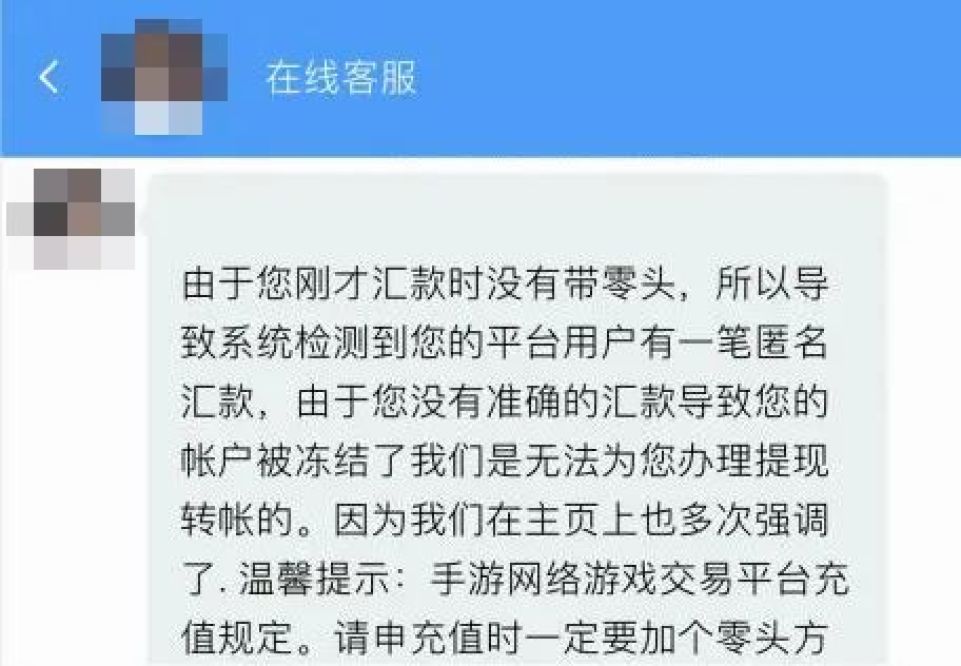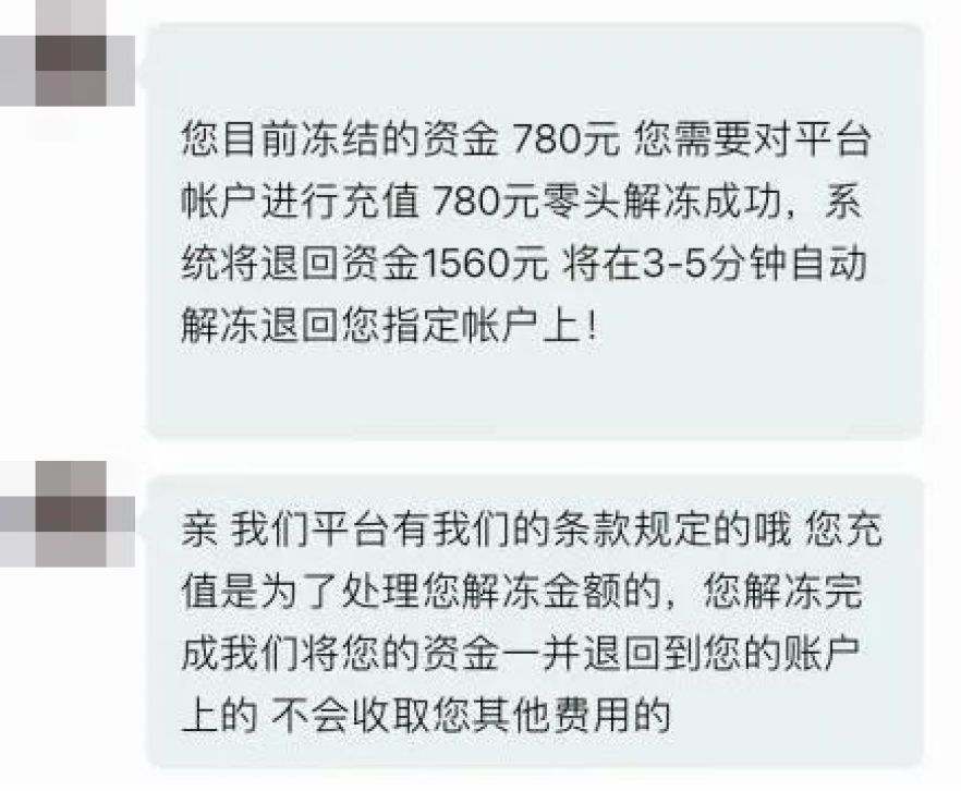 小王联系平台客服,对方称因其汇款时没带零头导致账户被冻结,需要缴纳780元解冻费。
