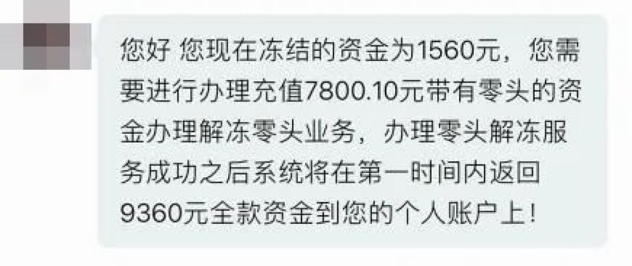 客服称需充值7800元带零头资金办理解冻零头业务,成功后9360元将返回至其个人账户,小王意识到被骗遂报警。