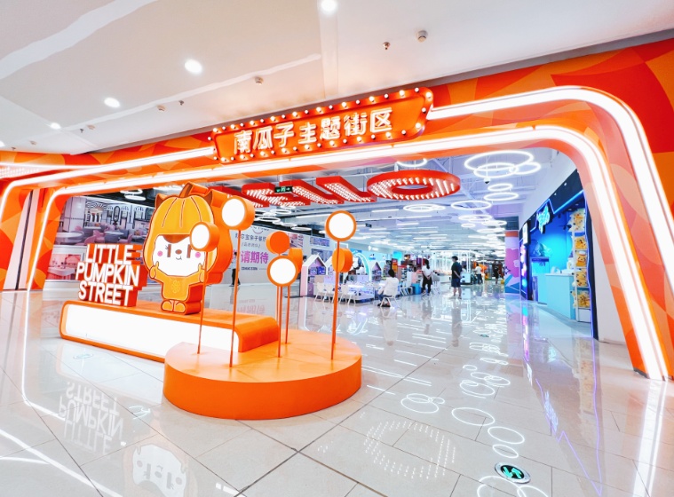 眼下来到于2021年开街的肉食南瓜街区,活泼可爱的IP形象结合造型各异的店招灯牌,大面积南瓜色系主题色彩的氛围装饰及暖色灯光,为街区增添年轻的能量。