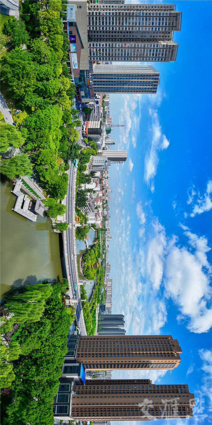 画面清晰、构图恢弘、信息量大,地标性建筑显著,表现出城市特色,表现出城市山水融合、传统与现代融合的特点,展示生态建设成就。