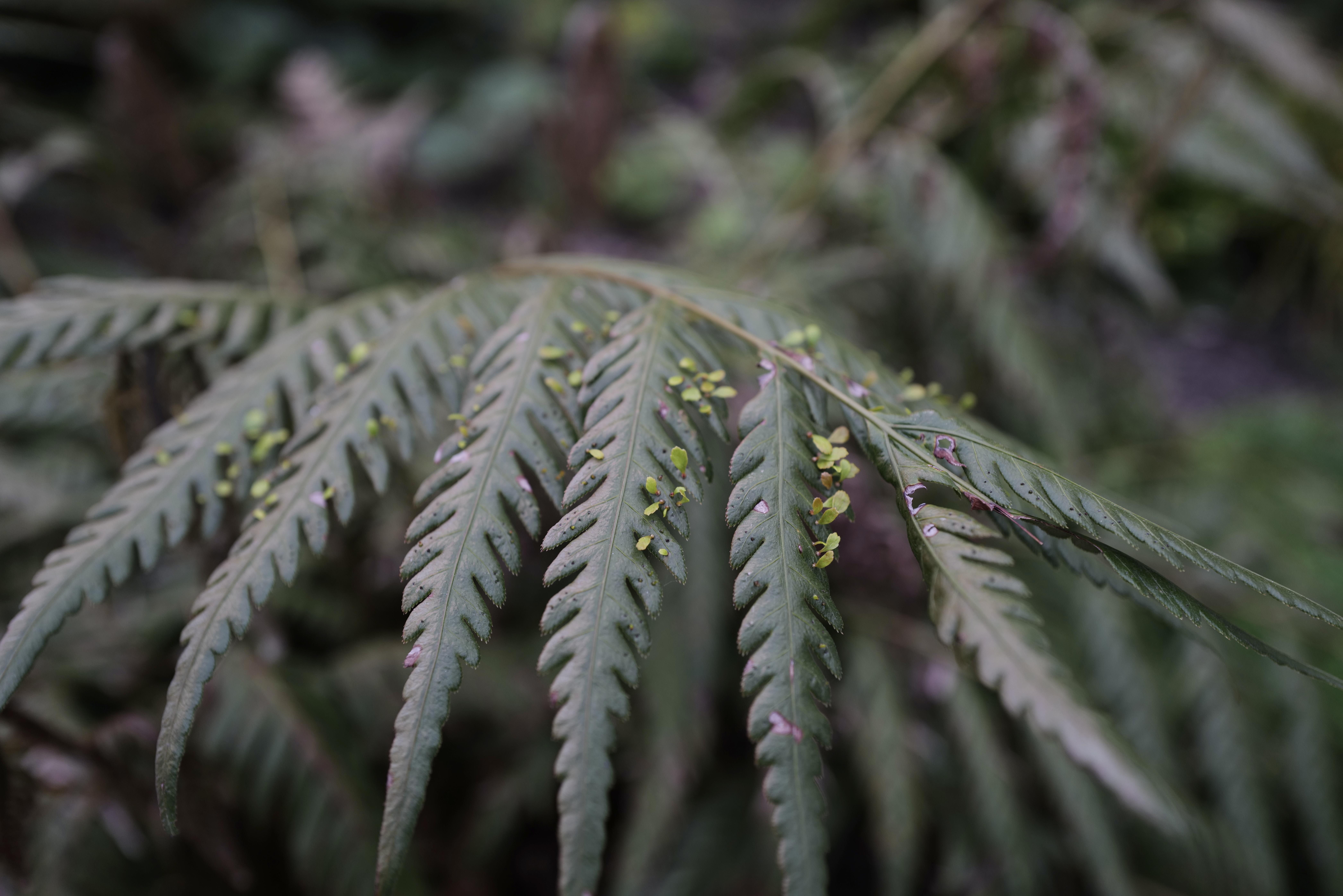 蕨类植物,也称羊齿类植物。它的叶子形态很独特,新生叶子弯曲成羽毛状。它不会开花也不会结果,是靠孢子进行繁殖。孢子囊在叶片表面成群地待着,到成熟时颜色逐渐变成褐色和红色。乍看之下,有点惊悚吓人。而这些密集的小叶片是蕨孢子体的珠芽。