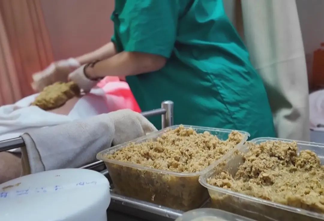 走罐完毕后,张洁颖拿出一盒生姜末,取拳头大小稍稍挤出水分,塑形并均匀铺在脊柱“打底”。“打底”的厚度在1.5厘米到2厘米,防止烫伤的同时,生姜具有走窜经络的特性,不仅能温经散寒,而且能增强艾绒活血化瘀通络的药力。“一个患者一次督脉灸要用掉三斤鲜姜。”