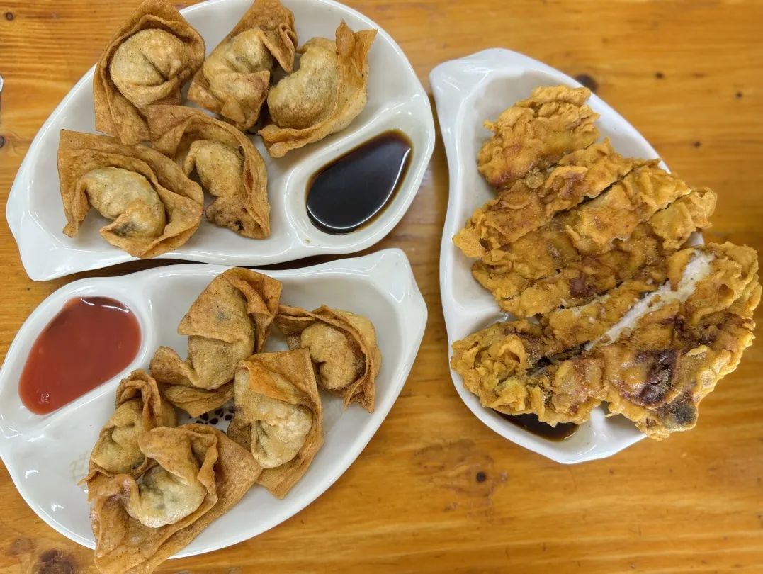 炸馄饨则完全不油腻,师傅对油温火候掌握得极佳,外皮炸得酥脆,馅料是老式的荠菜鲜肉,搭配了番茄酱和酱油两种蘸料,别有一番风味。另一招牌炸猪排肉质厚实,外酥里嫩,一口下去,幸福感满满。