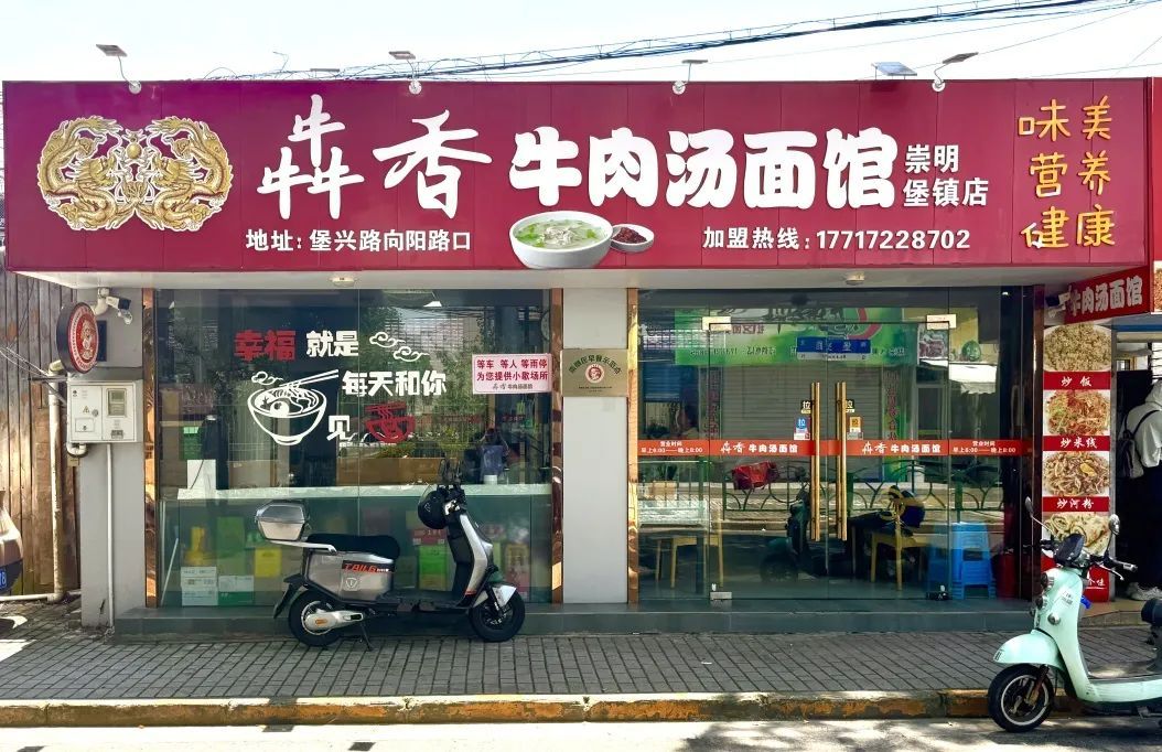 作为堡镇一家早餐示范点,犇香的店面不大,但经常满座。到了午市高峰,店里源源不断有客人进来吃面,很多老顾客都不用看菜单,进店只要喊上一句:“来碗白切牛肉汤面!”落座后不到三分钟,热气腾腾的牛肉面就会被抬到面前。
