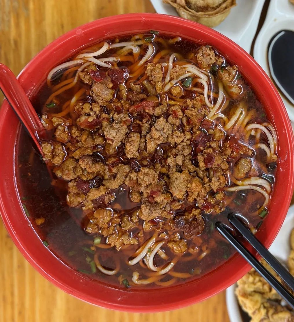 14块钱一碗的辣肉面是该店的明星单品。辣肉糜半肥半瘦、口感软嫩,面条软硬适中,经过汤汁的浸泡加持,更加鲜香入味。此时只需筷子一挥,巧手一拌,呼噜上一大口嚼香吞下,落胃饱腹,回味全是咸香满足。