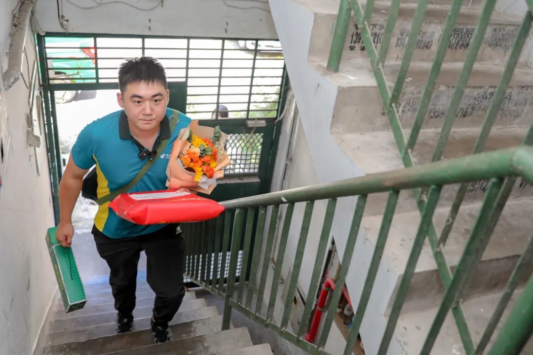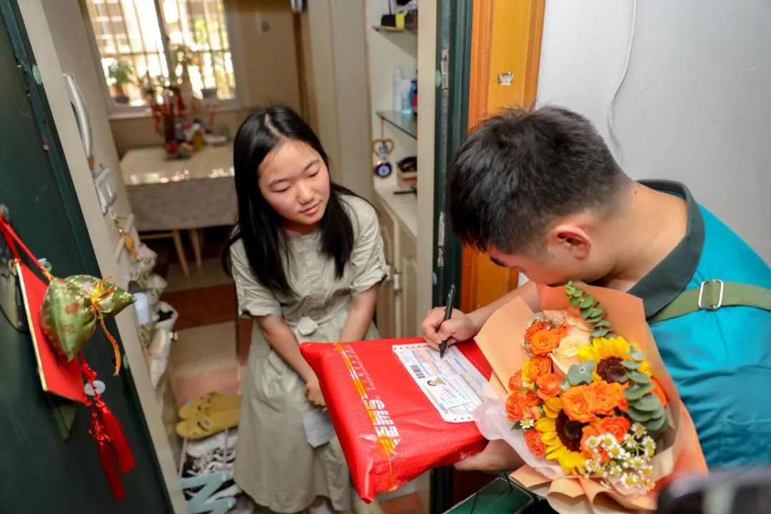 今天上午10点,上海邮政闵行区东川营业部的投递员吴昊驾驶着邮车,在仔细核对身份证、准考证信息并请收件人在详情单上签字后,将一封来自上海交通大学的录取通知书郑重地交到家住银都路的杨同学手中,还代表邮政给杨同学送上了邮筒弟文创盲盒和鲜花表示祝贺,一同见证她金榜题名的重要时刻。