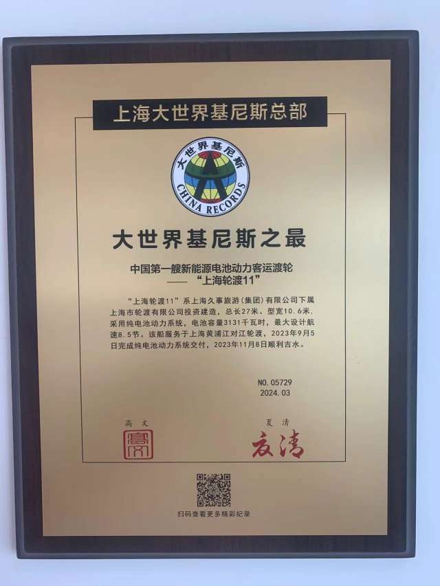 在黄浦江上营运的客运渡轮,即将迎来经上海大世界基尼斯总部认证的“中国第一艘新能源电池动力客运渡轮”——“上海轮渡11”。