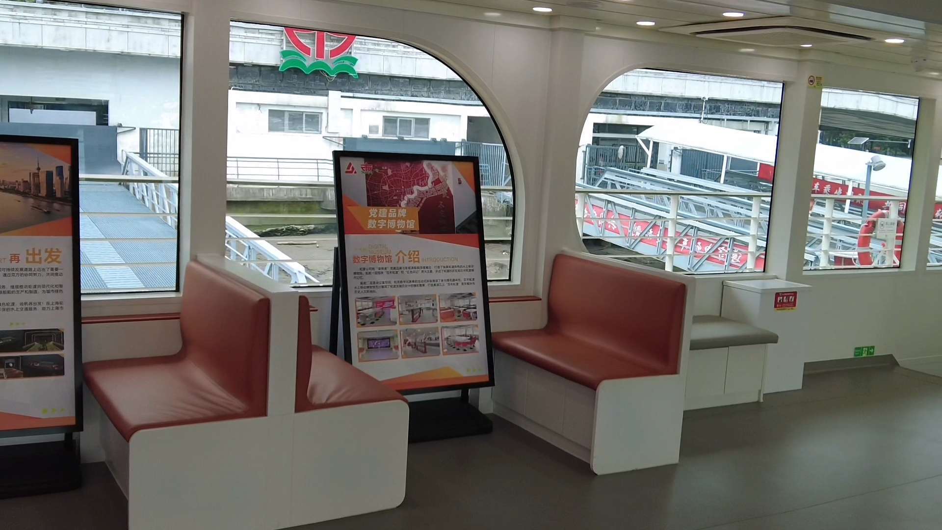 “上海轮渡11”船长 葛俊峰介绍,舱室安放软包座椅、设置充电接口。设计了顶层天窗和四周玻璃幕墙,使观光休闲体验更强。