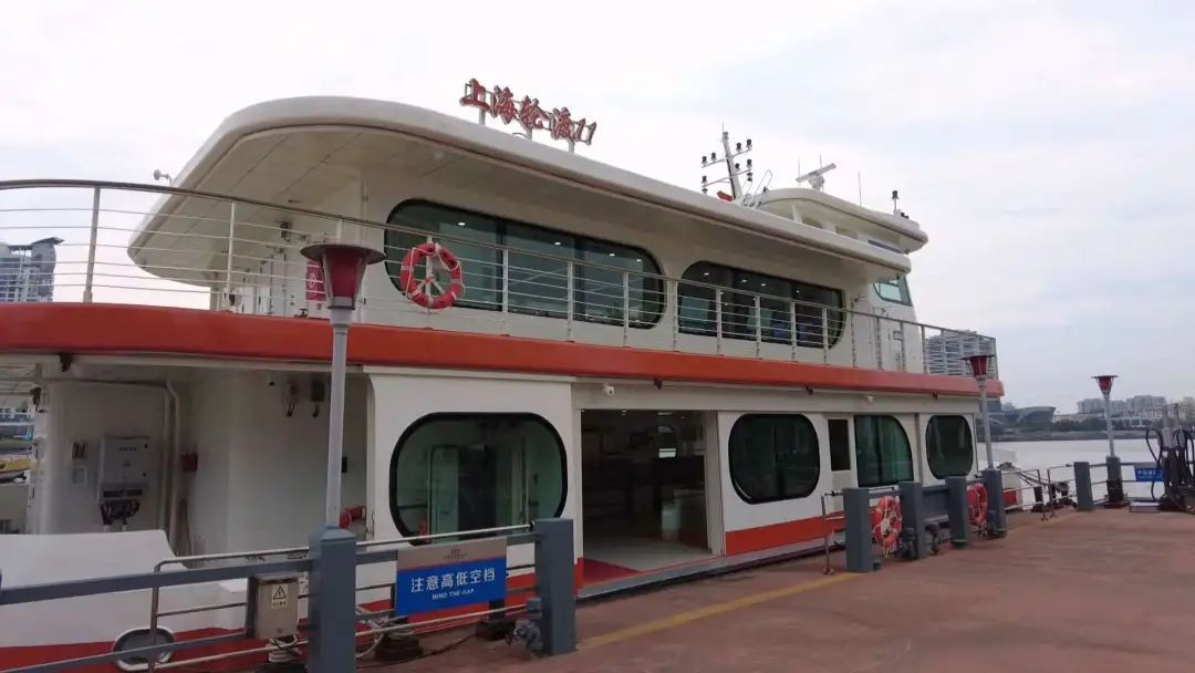 停在码头上的“上海轮渡11”船长27米,型宽10.6米,型深2.4米,吃水1.6米,船体采用单体双壳、圆舭线型为主、双机桨双舵船型,主船体为钢制材料、上层建筑为铝合金材料,设计了舱外色彩可调的船舶氛围灯,轮渡客船更具识别性。