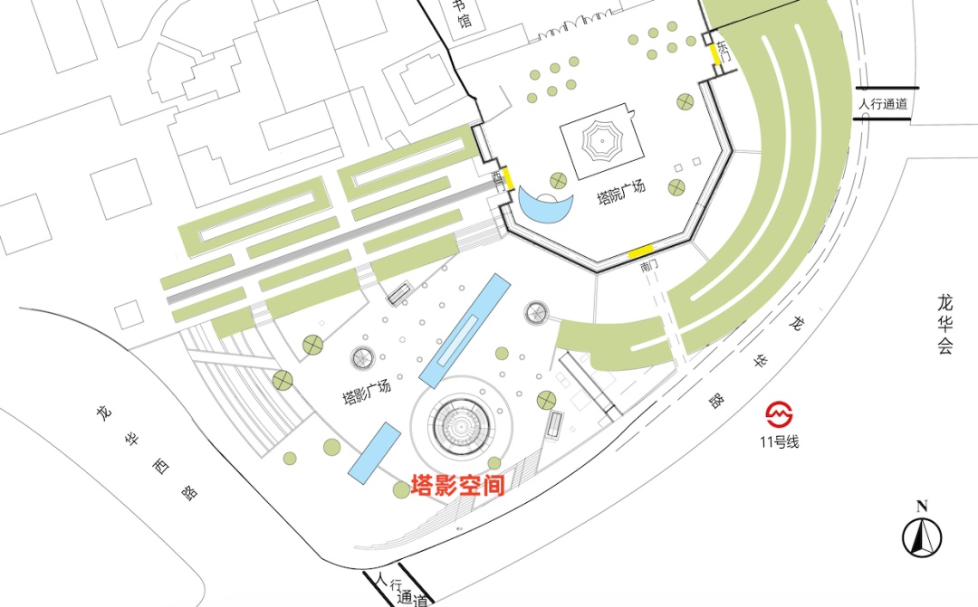 隐于塔院广场水域之下的塔影空间,别有洞天,是龙华地区一处备受市民游客欢迎的新晋人气“打卡点”,集阅读、休闲、艺术展示于一体,由“塔影”“归云”“听松”“迎月”四个功能区域组成。