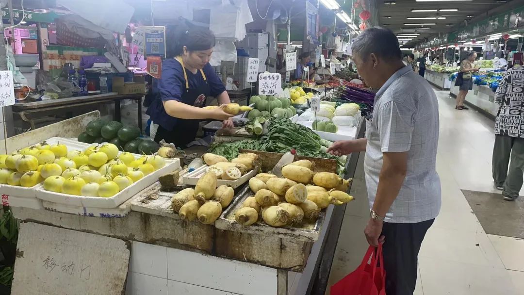 市民正在摊位上挑选莲藕