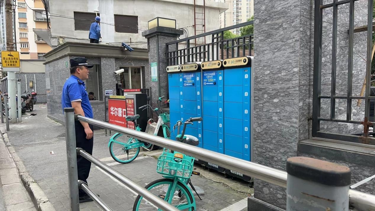 芷江西路街道综合行政执法队收到投诉后第一时间赶往现场,发现该小区入口旁的非机动停车位确实已被四个电瓶充电柜占用,执法人员随即开展执法调查,并联系到了当事人。