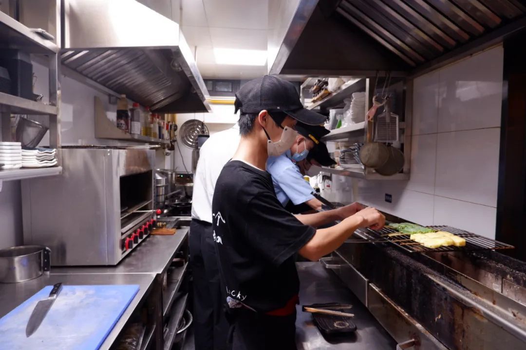 只有一步路的距离,也需要更换衣物吗?面对现场人员的提问,执法人员科普道:“冷菜加工时比熟菜风险更高,所以卫生要求更严苛。”商家对此进行了相应整改。
