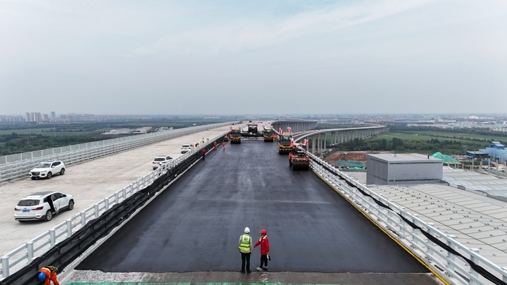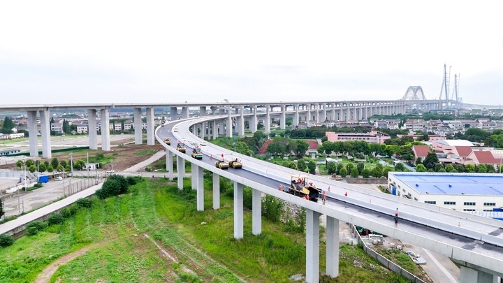 目前,常泰长江大桥上层高速公路环氧沥青路面已完成公铁合建段试铺,为后续大面积铺装提供了技术支撑和施工经验。全桥钢桥面将利用连续高温晴好天气持续摊铺,计划10月份完成。目前,大桥附属工程施工也在同步进行,全桥预计2025年上半年建成。