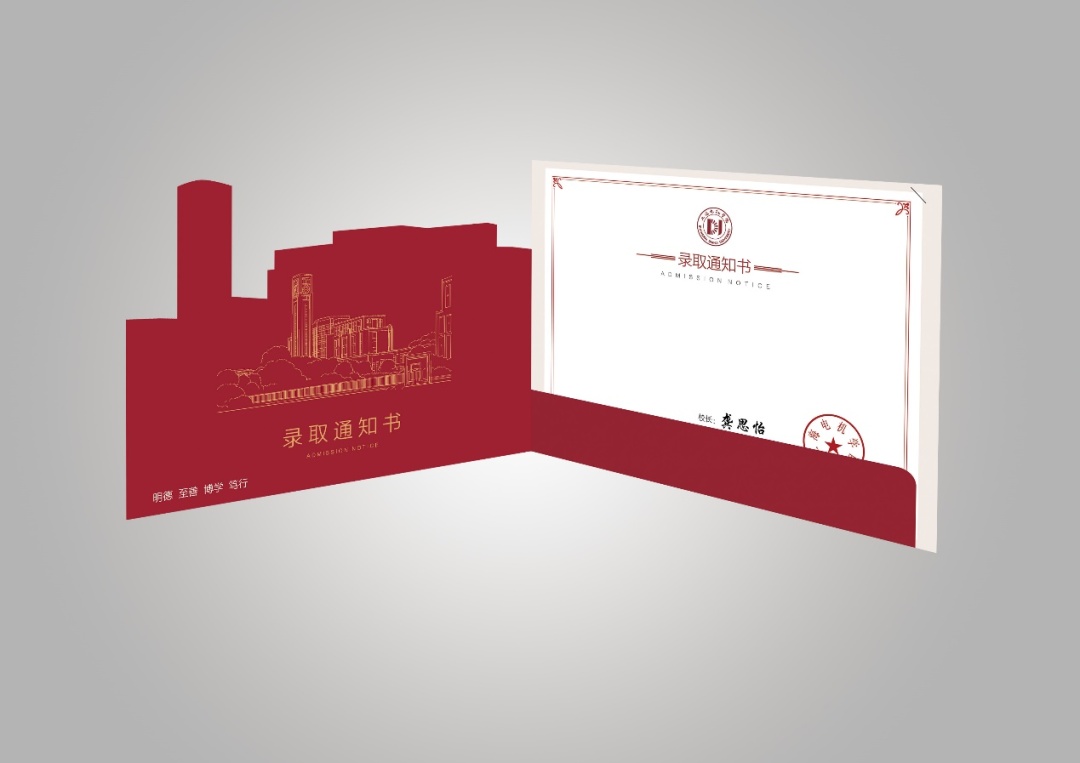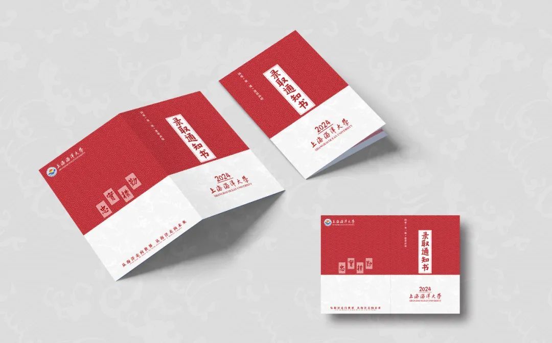 上应大2024年录取通知书,采用“封套+证书”的呈现方式。封套采用校庆红色调,以70周年校庆主视觉元素为主题,以奉贤校区中轴线标志性景观作为主设计元素,以徐汇校区优秀历史建筑的传统图式纹样点缀四方,展现上应大的历史根脉与深厚底蕴。以烫金工艺印刷,尽显热烈、隆重、大气,以扑面而来的喜庆氛围,热烈欢迎即将步入上应大校门的莘莘学子。封套内页印有校训“明德 明学 明事”,不仅阐释了学校的教育理念,也抒发了学校对每一位新上应学子的殷殷嘱托。