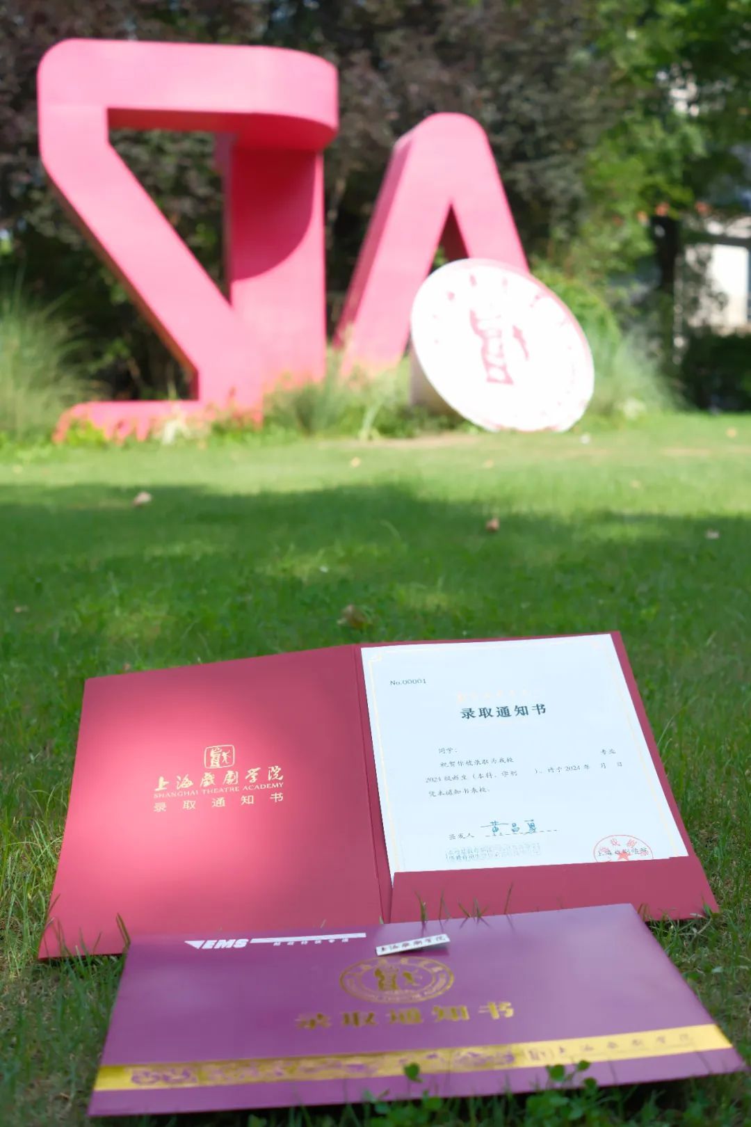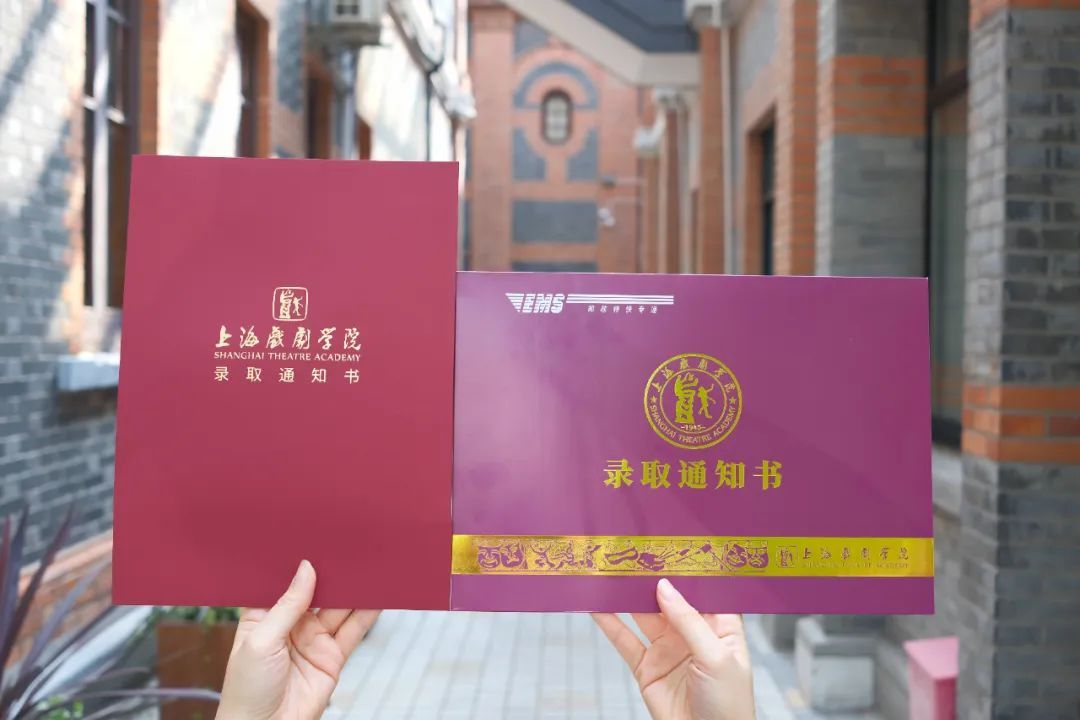 2024版上海戏剧学院高考录取通知书封套,以明代方以智所著《通雅》中记载的“北紫色”为底色,象征高贵端庄。1956年,在校名几经变更后,上海戏剧学院正式确定了此名并沿用至今。考虑到这一因素,EMS信封以及录取通知书底部图案选自1957年首次以上海戏剧学院名义举行的毕业公演海报上的通用纹底,其戏剧元素丰富多样,意象隽永,寓意由过往向未来的新篇章就此开启。