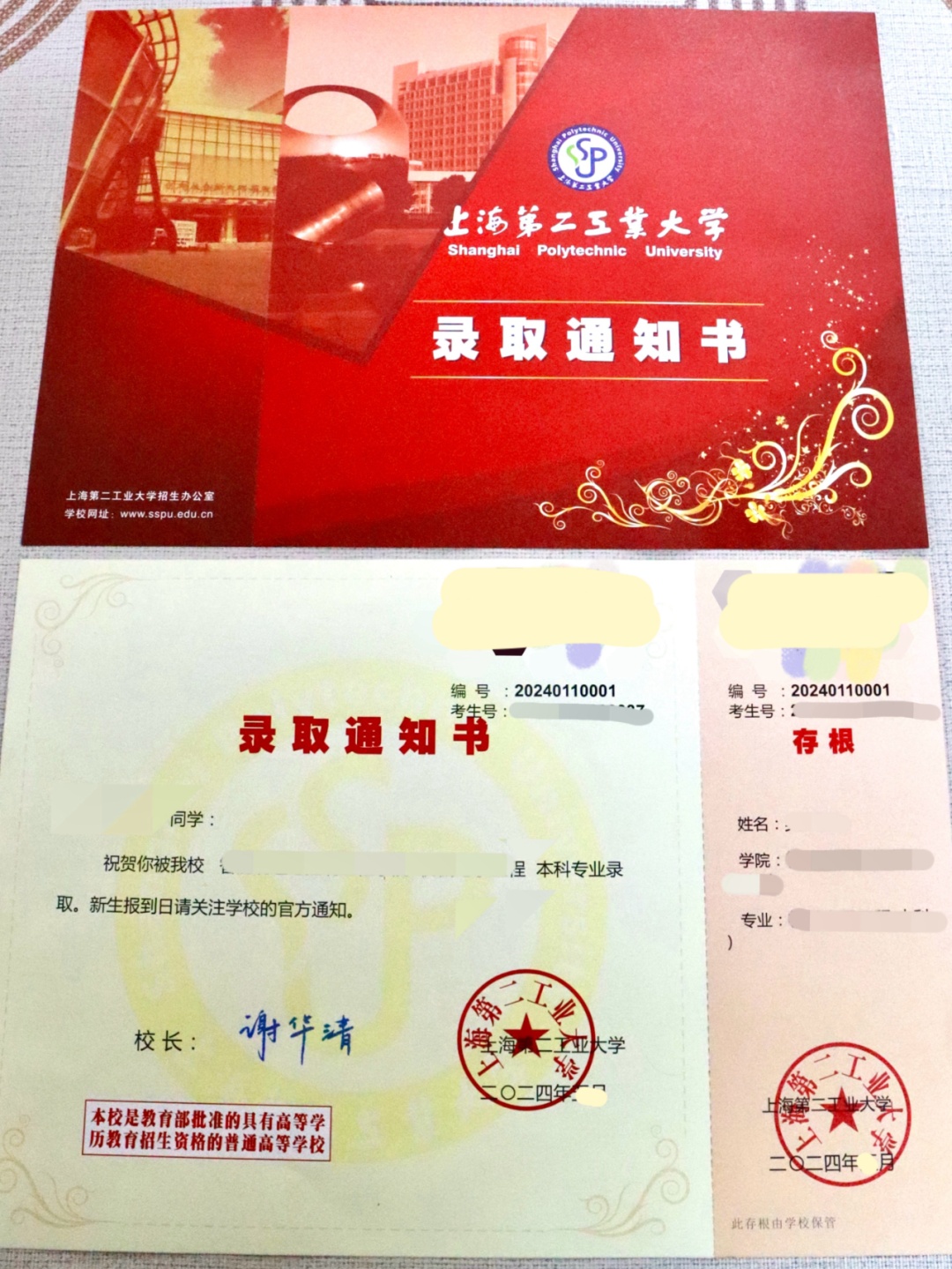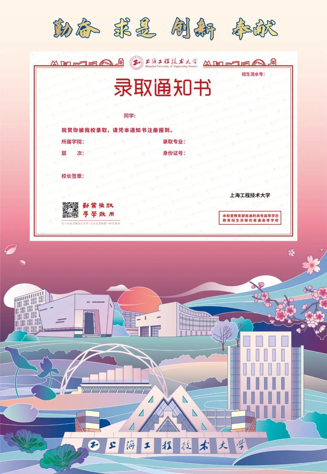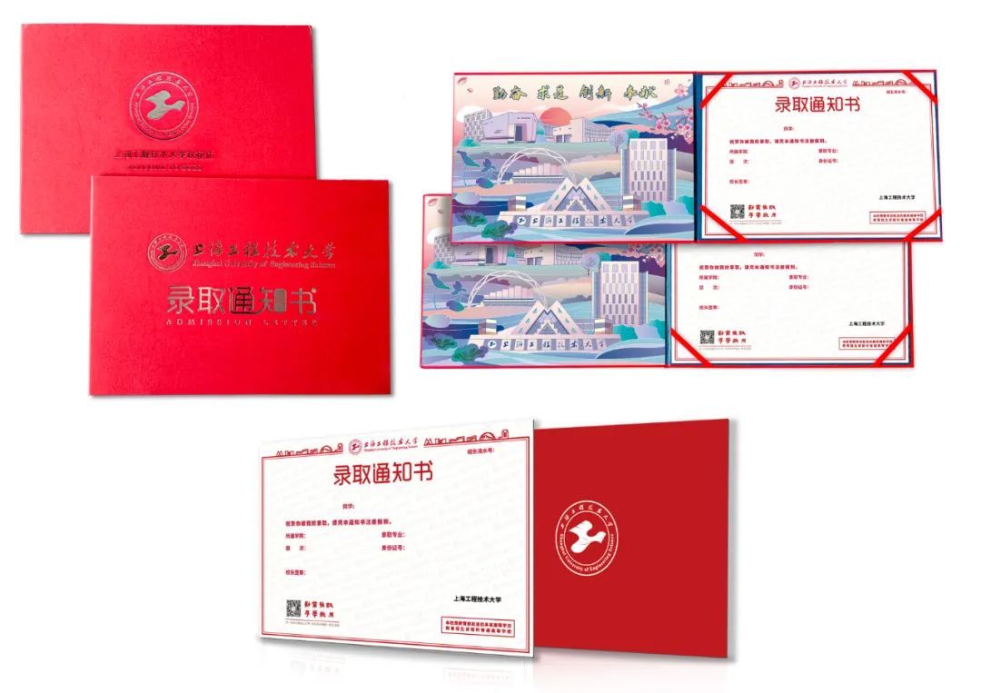 上海工程技术大学本专科录取通知书,匠心独运地以“成功红”为主色,绘就喜庆之韵;以“博学银”烫金文字,闪耀智慧之光;以“理想蓝”为内衬,象征海纳百川的博大胸怀。