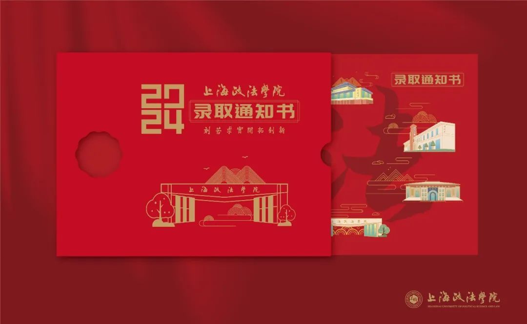 2024年上政录取通知书沿袭历年“上政红”主色调,喜庆庄重。采用镂空设计,花型中烫金logo熠熠生辉。封面为上海政法学院最新落成建筑成德楼的烫金剪影,简洁典雅,充满质感。通知书的整体采用抽拉形式。
