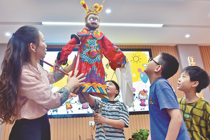 如皋市城北街道的孩子们在社区公益暑托班体验非遗木偶表演技艺。 吴树建 周锦旭 摄 (视觉江苏网供图)
