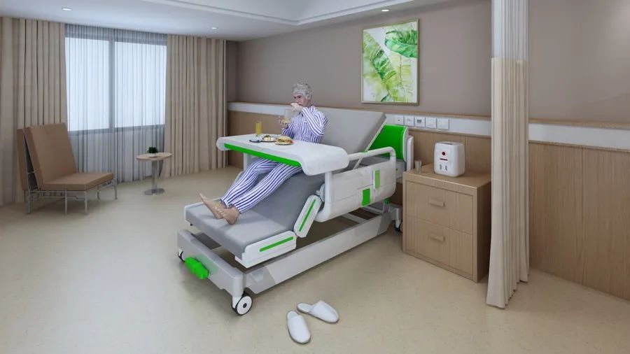 智能多功能护理床背部起升后,老年人坐在床上就餐(模拟图)。“人形机器人兴起后,老人护理的自动化、智能化程度将进一步提升,所以我们可以挖掘人形机器人的养老照护能力,通过模型训练让它们掌握各种护理和康复训练操作。”闫维新说。这个观点与市科委调研时了解到的情况颇为吻合——养老院反映,护工非常辛苦,半夜里也要起床为老人翻身,希望机器人未来能取代护工的部分工作。