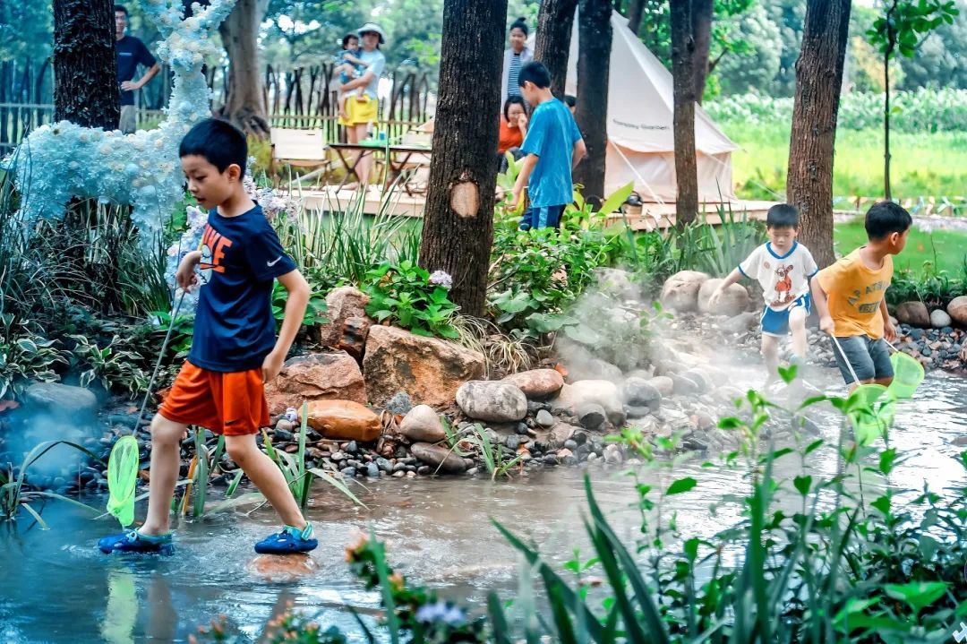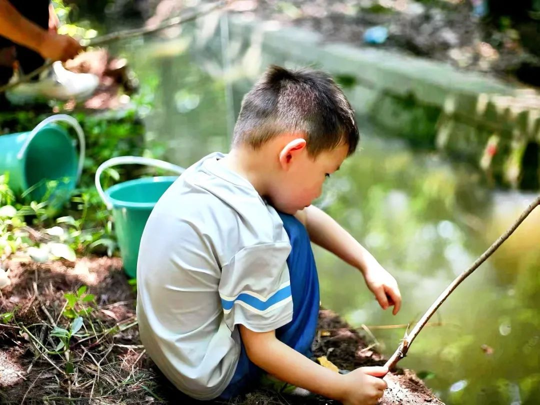 在林间阳光下,孩子们围在溪边,踩水嬉戏、捞鱼捉虾、打水仗,尽情感受着自然的魅力。在这美妙绝伦的环境中,享受着属于他们的欢乐时光。