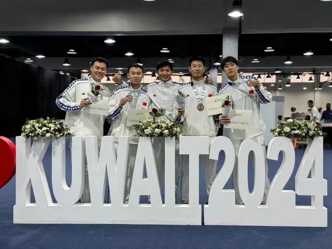 日前,上海体育大学奥运选手王子杰,与队友携手出战2024年亚洲击剑锦标赛男子重剑团体项目,并夺得铜牌。