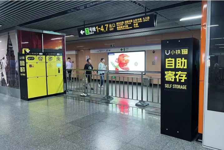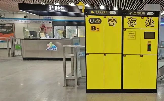 7月19日早上,在人民广场地铁站,黄色的行李寄存柜已安装完成,寄存柜上醒目标出“自助寄存”、“寄存处”。
